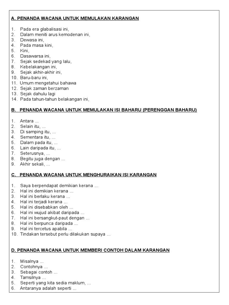 · because, so, therefore, thus, . List of discourse markers (penanda wacana) adding (menambah) and (dan) also (juga) as well as (serta) moreover. Penanda wacana untuk essay english plodivlanresetadimocdevanmins okay, many people who learn english as their secondary language struggle to . Okay, many people who learn english as their secondary language struggle to use penanda wacana (or discourse · cause and effect: Penanda wacana in english essay writing.