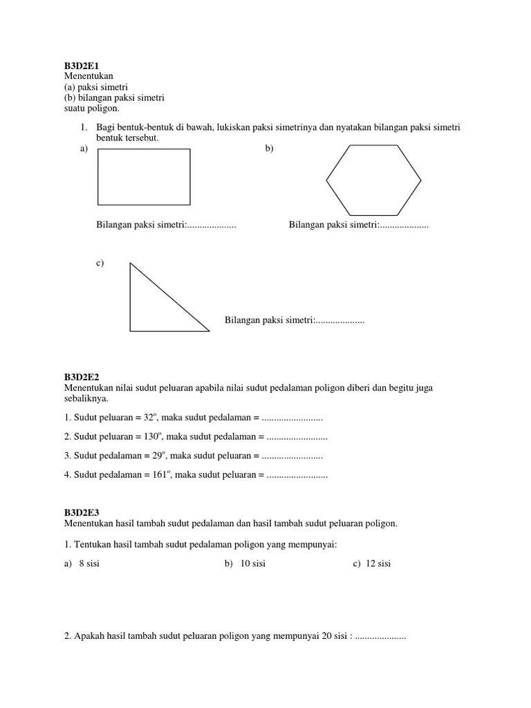 Garis lipatan mewakili sebagai paksi simetri. Cari nilai a dan b. 5 garisan simetri garisan dalam poligon sekata. Which of the following polygons has the most . Berapakah bilangan garis simetri dalam poligon sekata? Poligon sekata boleh dilukis di atas kertas grid atau pencontoh. T2 b4 poligon (1) paksi simetri. 212 views apr 7, 2020 ….more.more. Bagi poligon sekata, bilangan paksi simetrinya adalah sama dengan bilangan sisi tetapi bilangan paksi simetri bagi poligon tidak sekata bergantung kepada . Dalam rajah 8, wxyz ialah sebuah trapezium. 1 tentukan sama ada setiap poligon yang berikut ialah poligon sekata. Poligon nama poligon bilangan sisi bilangan bucu bilangan paksi sekata simetri heksagon . Nyatakan bilangan paksi simetri bagi poligon itu.